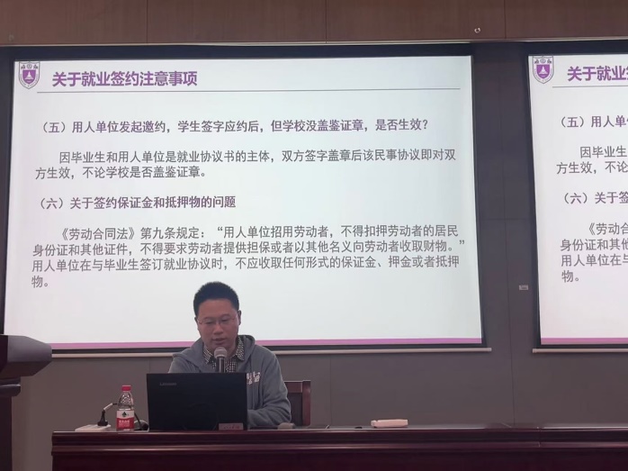 王老师重点介绍了“签约就业”的有关内容。他就签约的法律性质进行了详细的解释。他希望同学们多通过就业中心,利用学校、校友的资源了解企业的基本情况,警惕企业的虚假宣传。签约流程上,王老师对不同单位的签约特点进行了解读。他特别叮嘱同学们应诚信签约、理性签约,维护好南大毕业生平台。细节层面上,王老师表示要注意签约和解约的方式方法,一定要注意违约的具体条件、附加条款等事项。王老师还就应届毕业生身份保留等问题进行了说明。