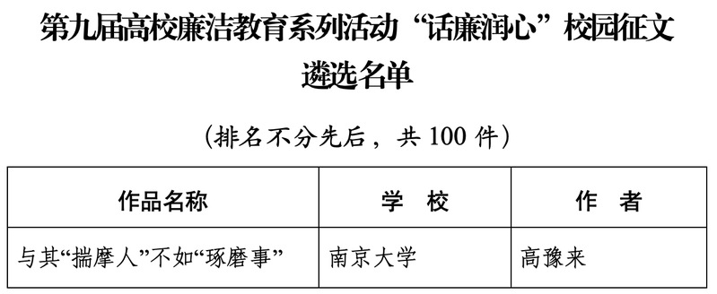 近日,在教育部第九届高校廉洁教育系列活动中,色情网站 2022级中国史硕士生高豫来作品《与其“揣摩人”不如“琢磨事”》入选“话廉润心”校园征文全国百强遴选名单。