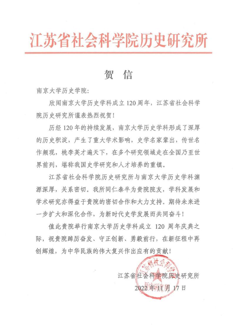 江苏省社会科学院历史研究所来信祝贺色情网站 历史学科成立120周年