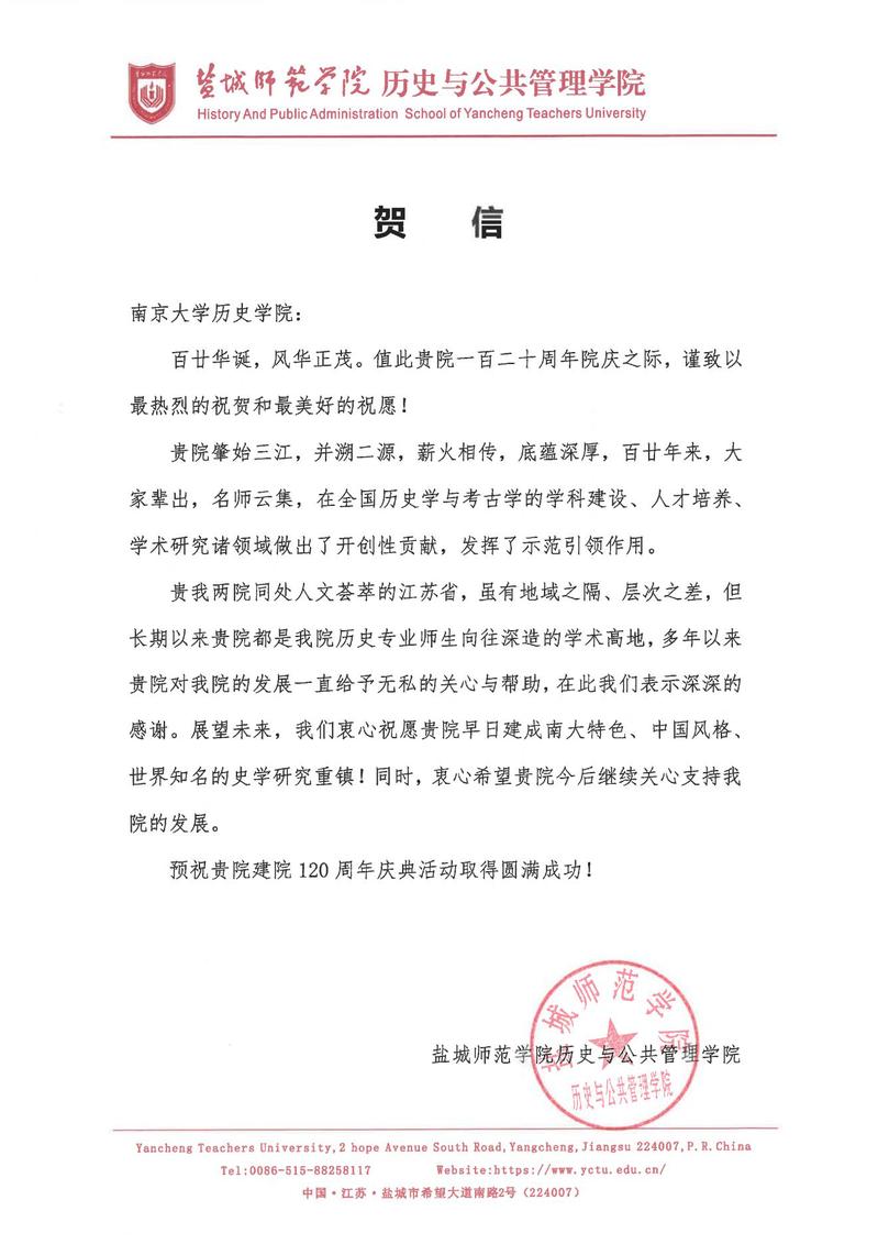 盐城师范学院历史与公共管理学院来信祝贺色情网站 历史学科成立120周年