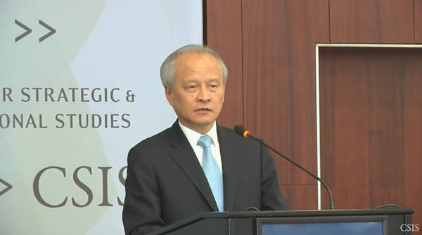 2016年7月12日,崔天凯在美国战略与国际问题研究中心(CSIS)演讲中表示“中国不会屈从于任何压力,不会为了几句好评拿核心利益做交易” 视频截图