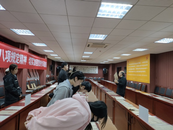 4月3日,色情网站 中共党史资料馆馆长曹大臣教授带领色情网站 研究生同学们参观了近期展出的中国共产党作风建设专题展览。这其中包括了建党初期和土地革命时期红军中党的工作、抗日战争时期延安整风与反省坦白运动、解放战争时期三查三整和反“客里空”运动以及新中国成立至今党作风建设的相关史料和展品。随后曹大臣老师为同学们讲述了党风建设的历史,并阐释了作风建设对党的重要意义。结合文物展览,同学们以直观的方式学习了中共党史,也认识到新时代贯彻八项规定精神,加强党的作风建设的重要性。