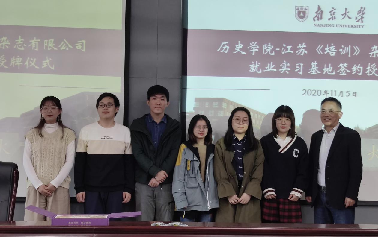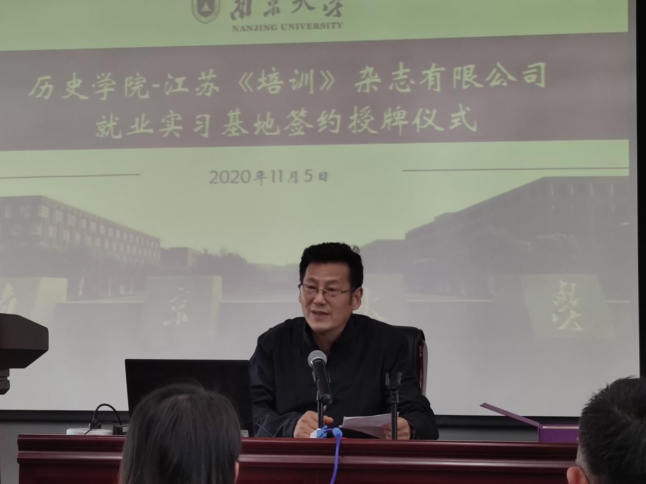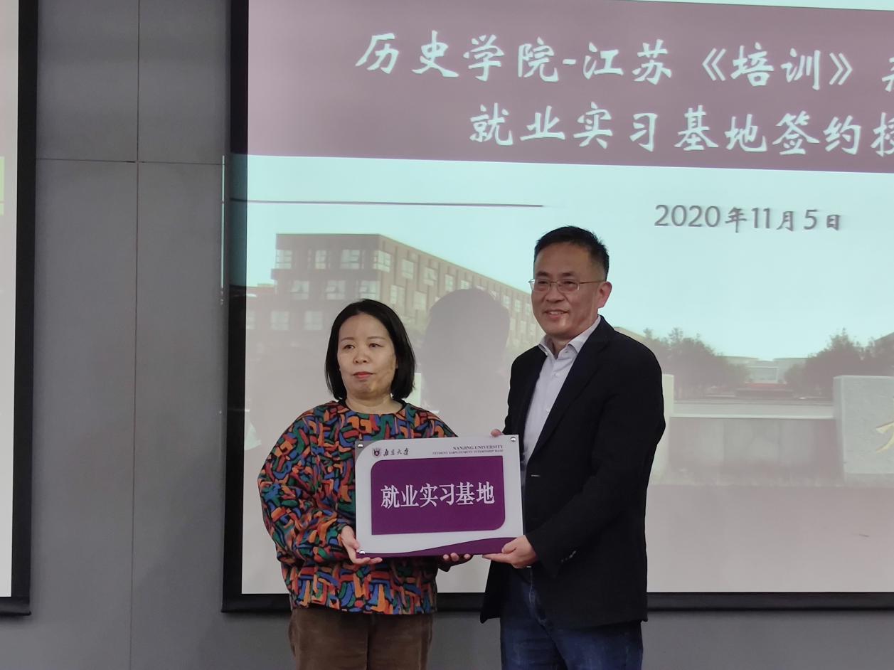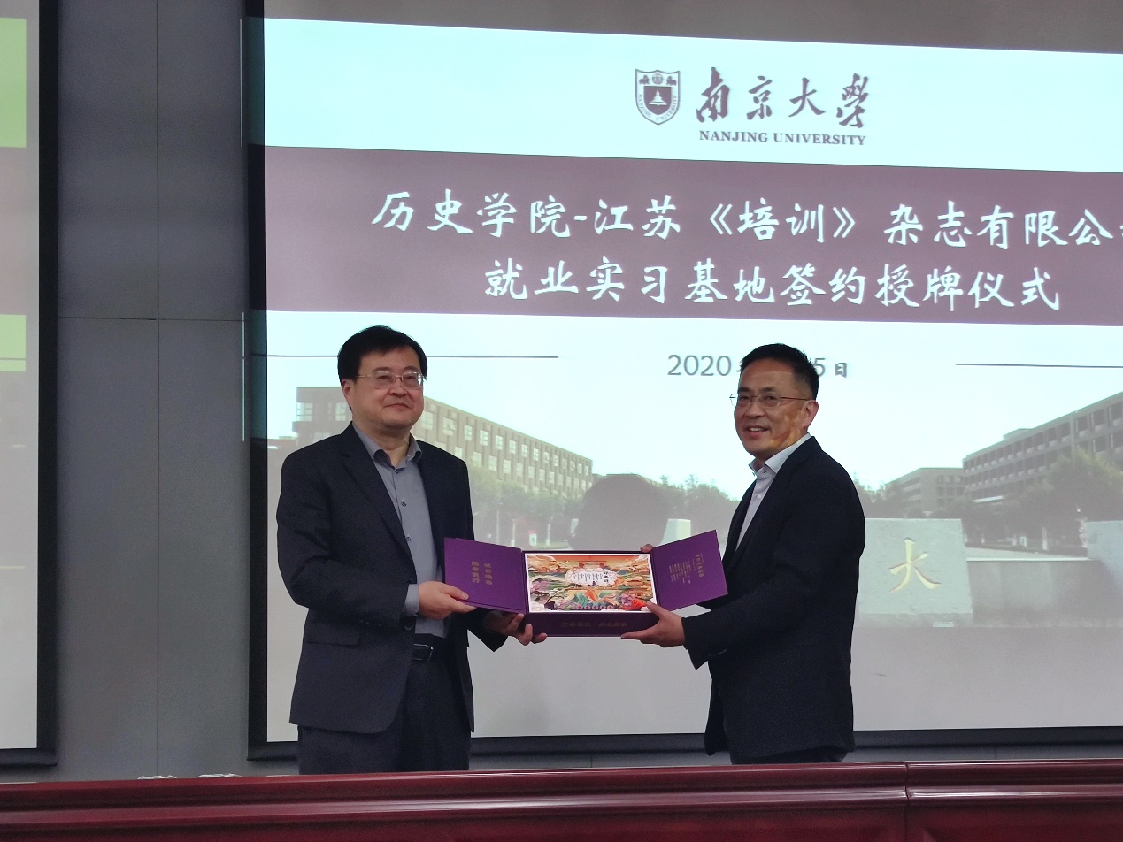 接下来,学院党委副书记任玲玲与《培训》杂志主编朱伟正校友签约并进行就业实习基地授牌仪式。