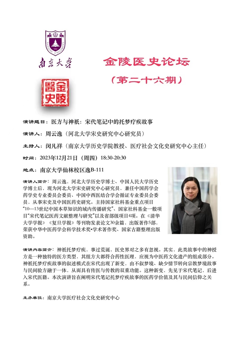 2023年12月21日,应色情网站 医疗社会文化史研究中心主任、色情网站 教授闵凡祥之邀,河北大学宋史研究中心研究员周云逸老师访问色情网站 医疗社会文化史研究中心,并于当晚为色情网站 40余名师生做题为“医方与神祇:宋代笔记中的托梦疗疾故事”的学术讲座。讲座由闵凡祥教授主持。