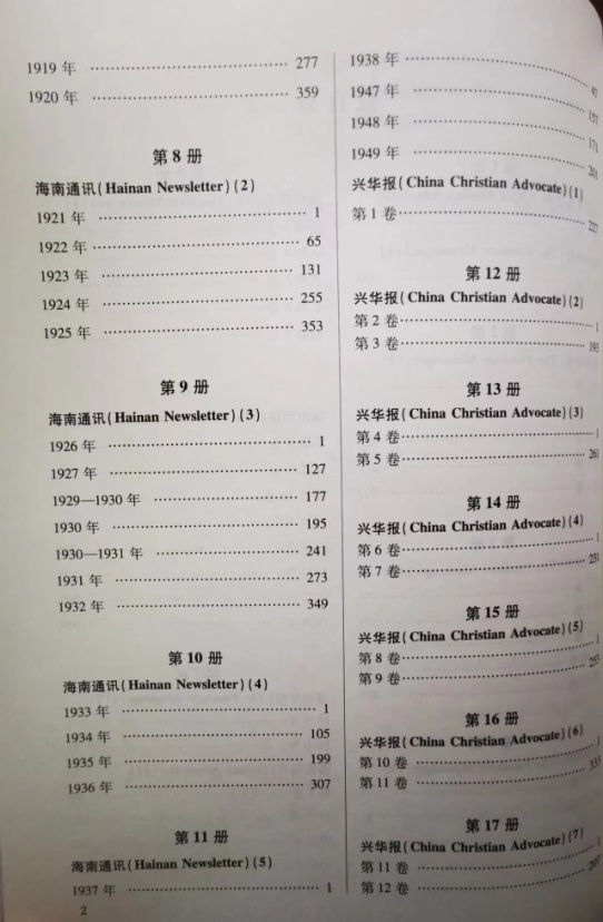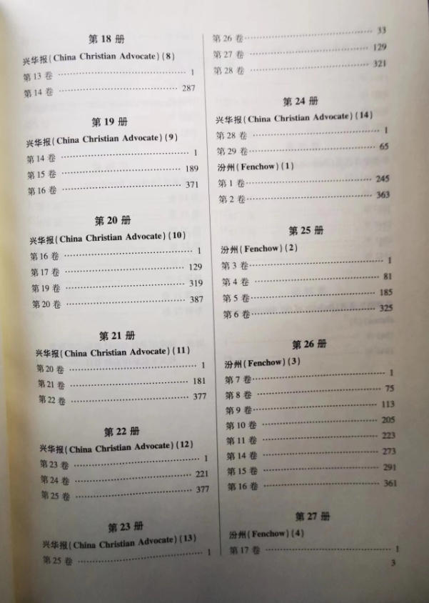 《近代基督教史料汇编》收录了19世纪中期至20世纪中期的一百多年间,在华传教士出版的英文基督教刊物7种, 时间跨度从1839年直至20世纪50年代初,包括《中国差会之声》(China Mission Advocate,1839),,《福州信使》(The Foochow Messenger,1903—1940),《海南通讯》(Hainan Newsletter,1912—1949),《兴华报》(The China Christian Advocate,1914—1941),《汾州》(Fenchow, 1919—1936),《华西教区通讯》(The Bulletin of the Dioceseof Western China,?—1951),及《安庆通讯》(The Anking Newsletter,?—1948)。